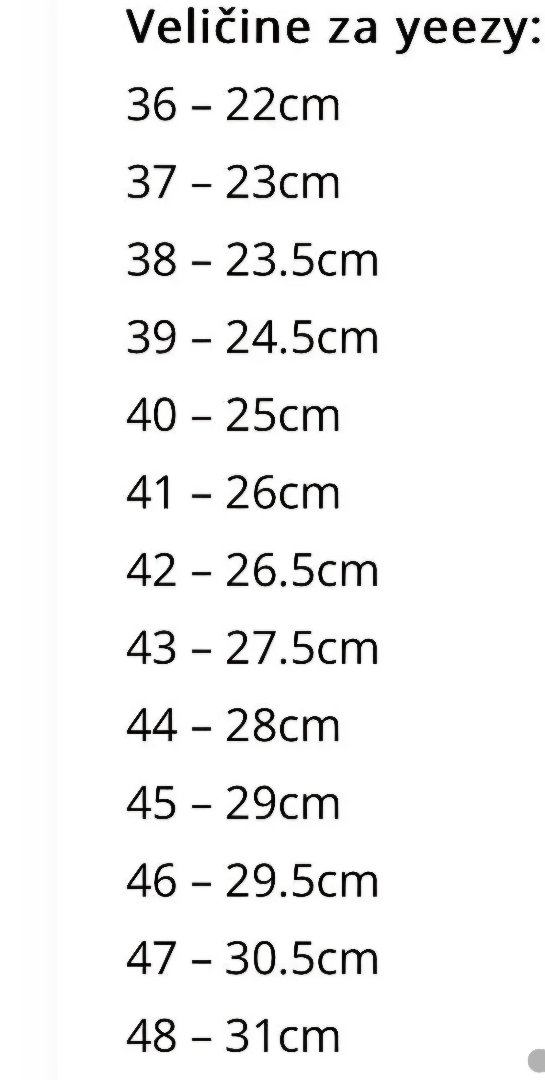 36-22cm 37-23cm 38-23.5cm 39-24.5cm 40-25cm 41-26cm 42-26.5cm 43-27.5cm 44-28cm 45-29cm 46-29.5cm 47-30.5cm 48-31cm Za tocu veličinu izmjeriti od pete...